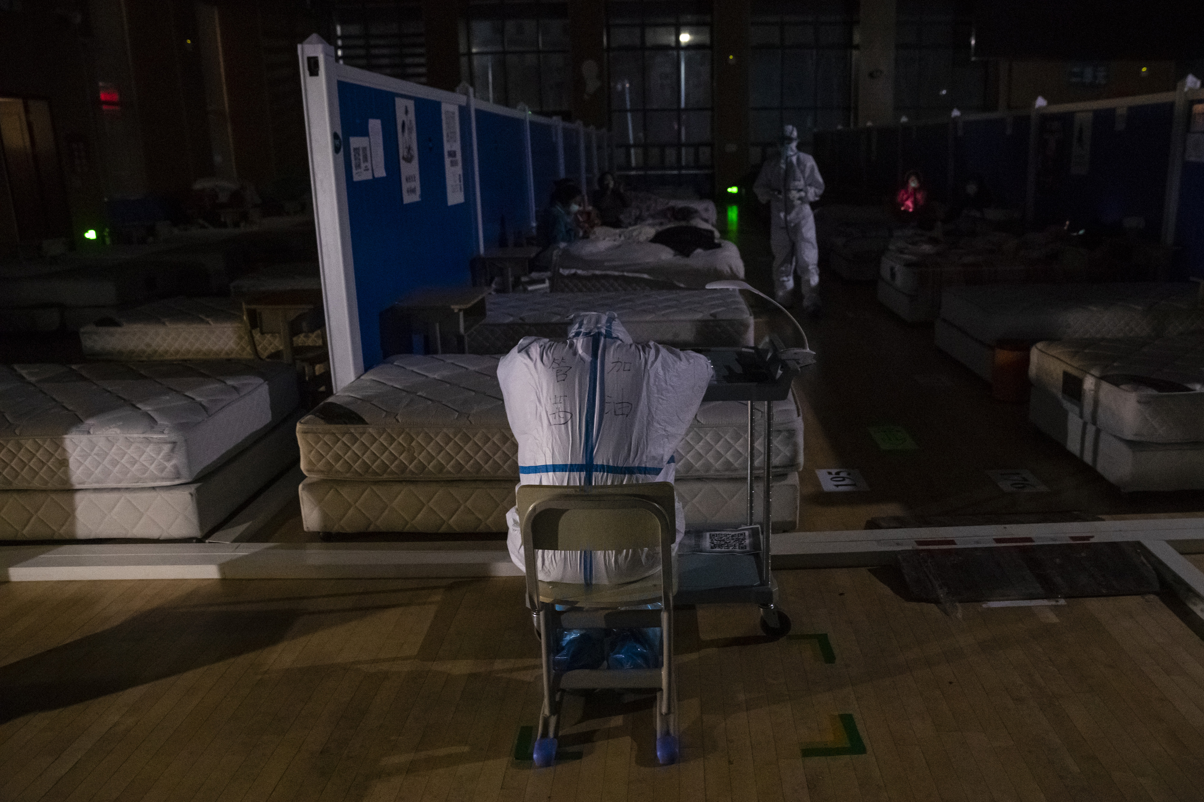 ↑3月9日晚,在位于武汉市洪山体育馆的武昌方舱医院,江西支援湖北医疗队队员胡佩在熄灯后巡视。