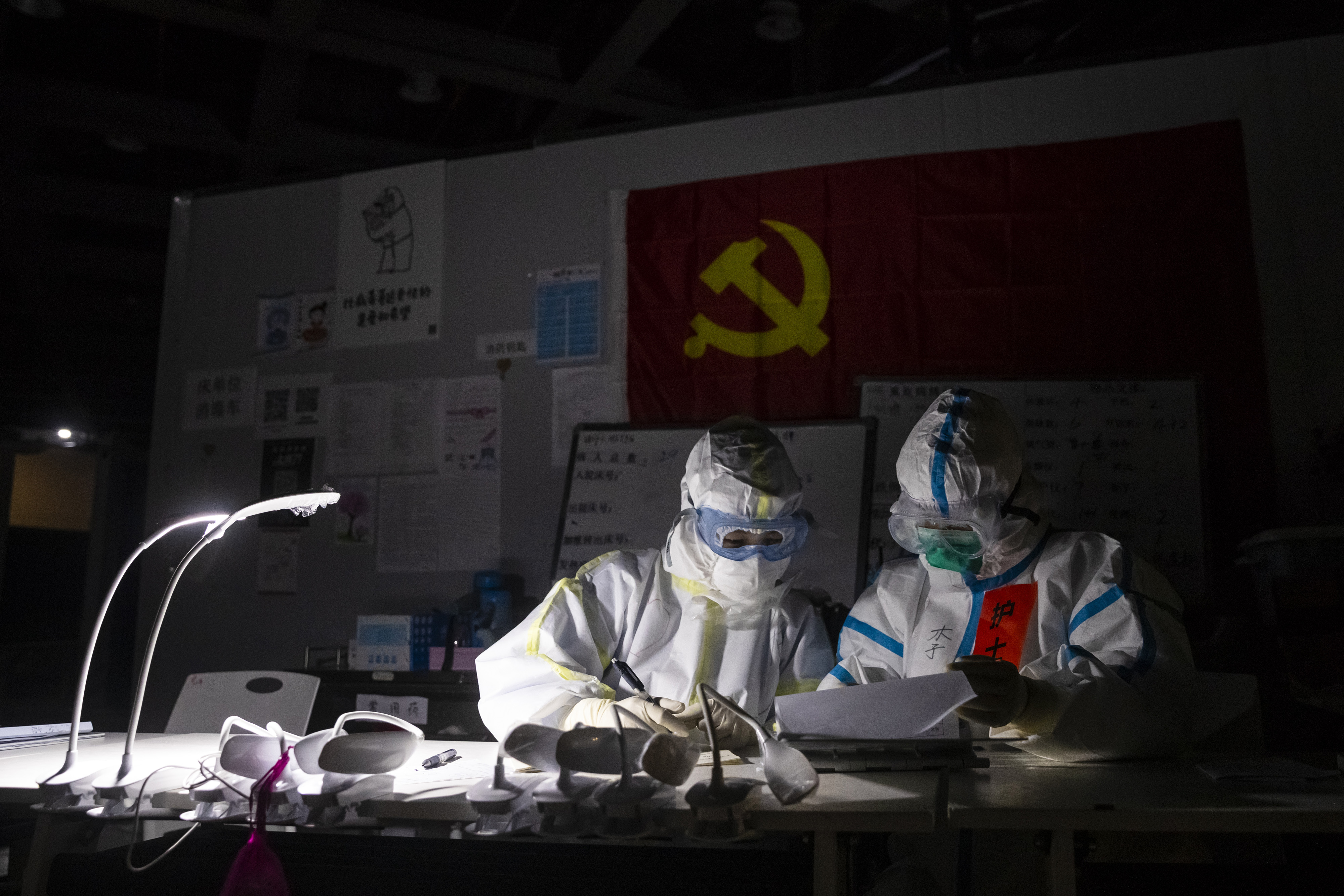 ↑3月9日晚,在位于武汉市洪山体育馆的武昌方舱医院,江西支援湖北医疗队队员胡佩(左)和护士李政嫱在护士站工作。
