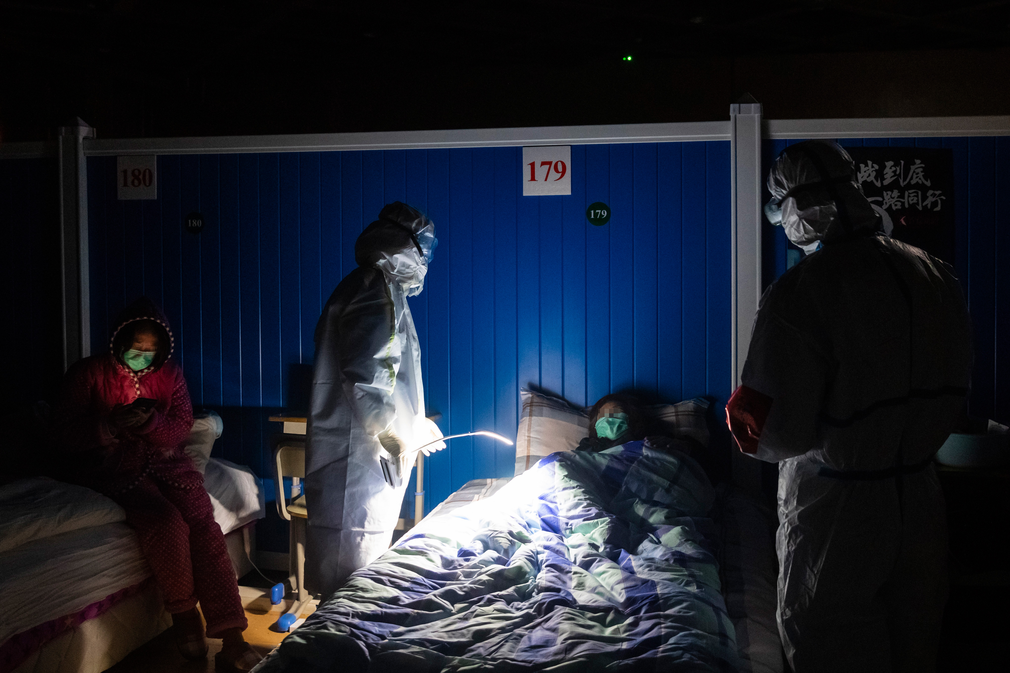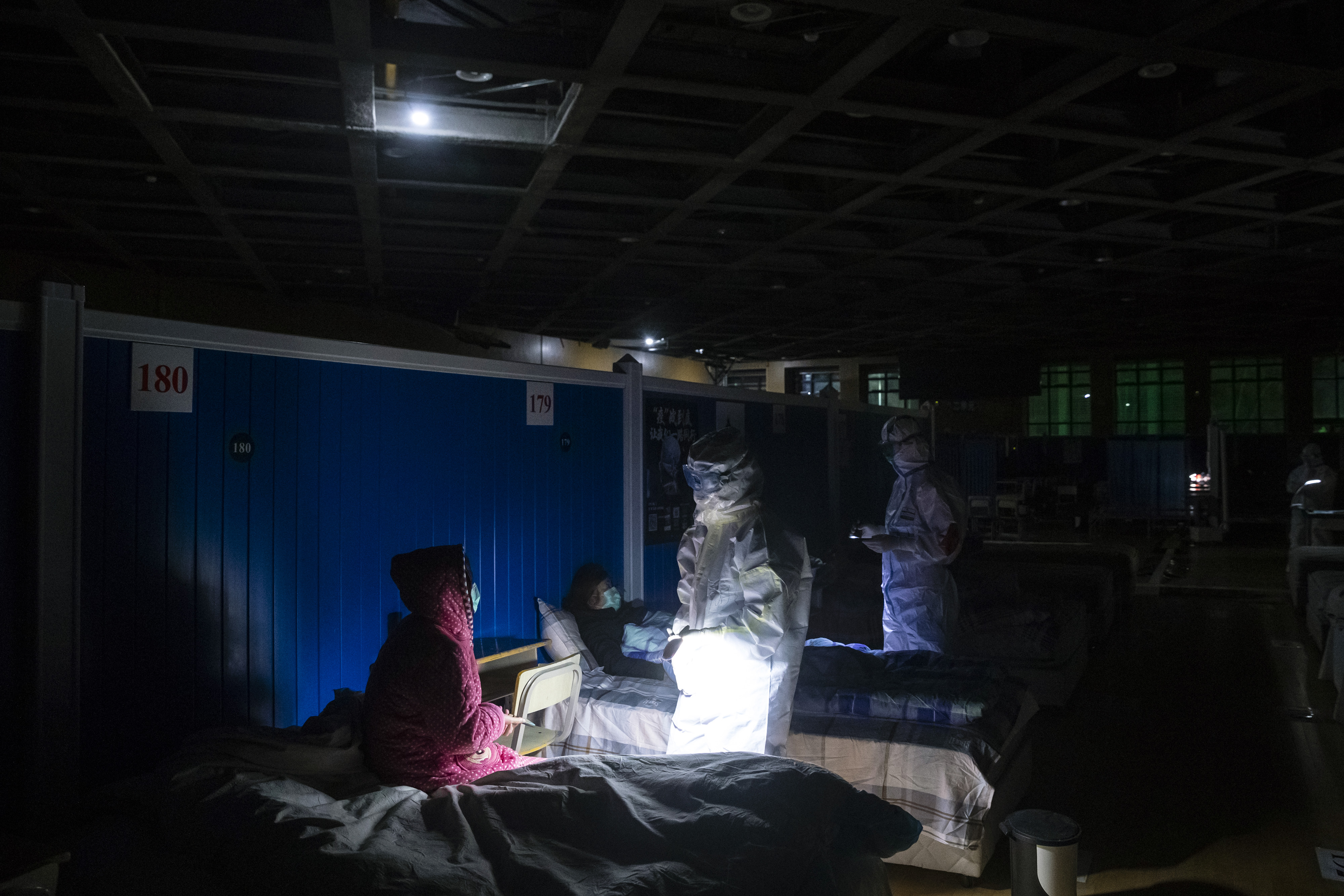 ↑3月9日晚,在位于武汉市洪山体育馆的武昌方舱医院,江西支援湖北医疗队队员胡佩在熄灯后巡视,查看患者休息情况。