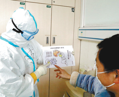 为缓解患者的焦虑情绪,在武汉大学中南医院隔离病房,河北医疗队护士用漫画同患者交流。