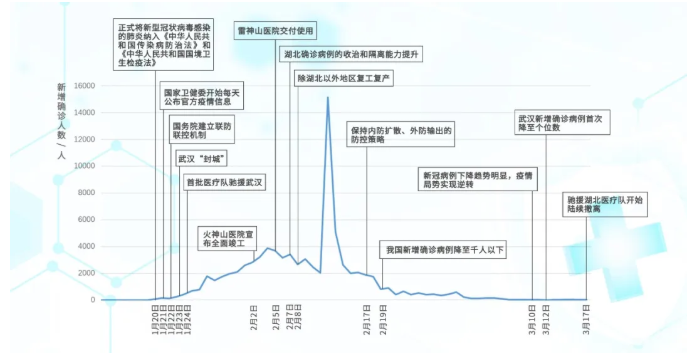 2月中旬之后,战“疫”进入新阶段。2月19日,我国新增确诊病例降至千人以下。3月10日,武汉市14家方舱医院全部休舱。3月12日,距离武汉“封城”已有50天,武汉新增确诊病例首次降至个位数。国家卫健委宣布,我国本轮疫情流行高峰已经过去。3月16日0-24时,湖北省新增新冠肺炎确诊病例1例,其中:武汉市1例,其他16个市州均为0例。无境外输入性病例。