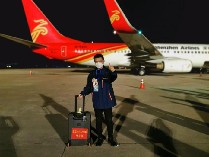 3月17日晚,柯章敏结束50多天的支援,从武汉乘坐飞机抵达南京禄口机场。受访者供图