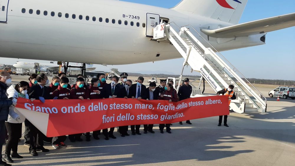 3月18日,第二批中国抗疫医疗专家组一行13人当日抵达米兰马尔奔萨机场,随机携带了呼吸机、双通道输液泵、监护仪、检测试剂等9吨中方捐助的医疗物资。(新华社发)