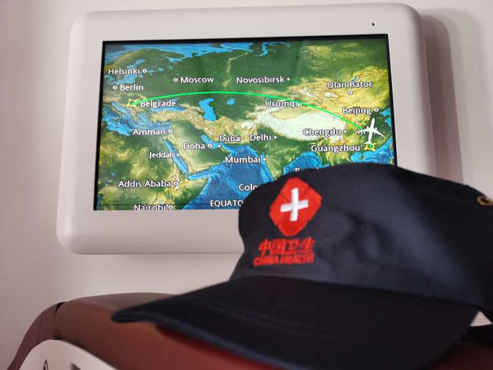 ⬆️这是3月21日在广州飞往塞尔维亚首都贝尔格莱德的专机上拍摄的中国抗疫医疗专家组成员的帽子,后面的电子屏幕显示着广州至贝尔格莱德之间的航路图。