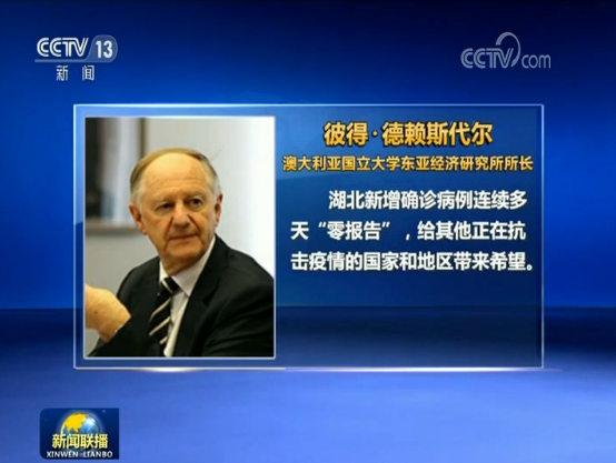 澳大利亚国立大学东亚经济研究所所长彼得德赖斯代尔表示,湖北新增确诊病例连续多天“零报告”,给其他正在抗击疫情的国家和地区带来希望。