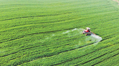 日前在湖北省襄阳市高新技术产业开发区李冲村,大型植保机械在麦田喷洒农药和叶面肥。