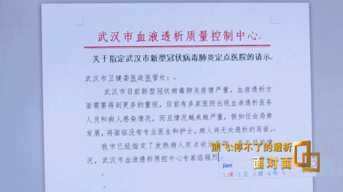 武汉市血液透析质量控制中心主任熊飞:这些病人诉求很简单,能有地方透析。但随着疫情发展,对我们医生的压力和考验越来越大。让你在非感染区透析会导致其他感染,这就违反了我的底线原则。不让你透析,一个活生生的生命,所以我们当时压力很大。我就把病人的数据提交给上级部门,告诉他有多少病人如果不透析,超过多长时间可能会面临着死亡,领导也重视这个问题。