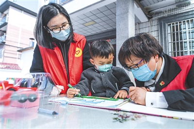 杭州志愿者助力“抗疫一线医护人员子女关爱计划”。图为志愿者来到浙江省杭州市富阳区东洲街道紫铜村,陪同4岁的抗疫一线医护人员子女一起画画、玩游戏。新华社发