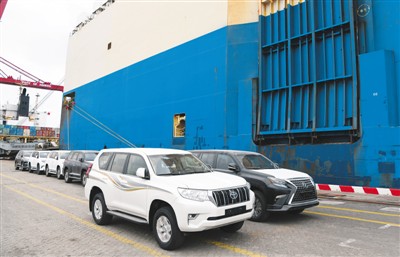 在海南自贸试验区海口港,来自卡塔尔的平行进口车停靠在滚装货船旁。