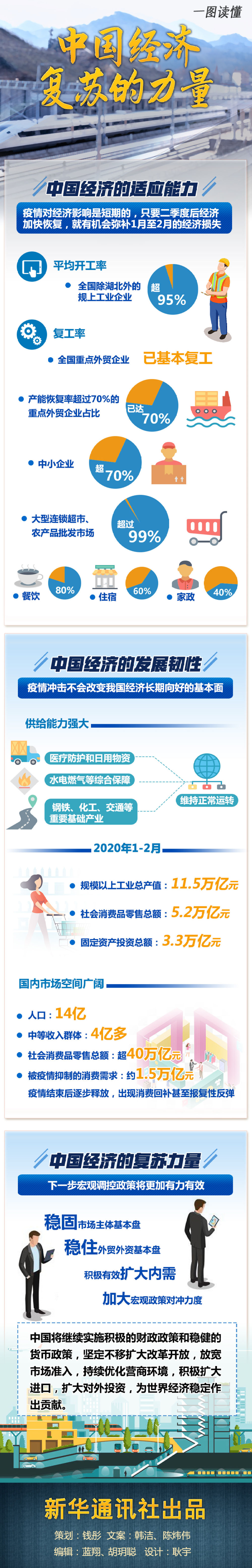 即便遭受疫情冲击,我国无论是医疗防护和日用物资,还是水电燃气等综合保障,以及钢铁、化工、交通等重要基础产业,都维持正常运转。前两个月,规模以上工业总产值达11.5万亿元,社会消费品零售总额5.2万亿元,固定资产投资总额3.3万亿元。这都显示出大国经济强大的供给能力、适应能力。