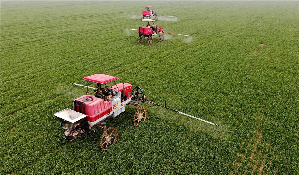 3月9日,河北省南和县郝桥镇后西村农民操作农业机械在麦田喷洒农药(无人机照片)。新华社记者 朱旭东 摄