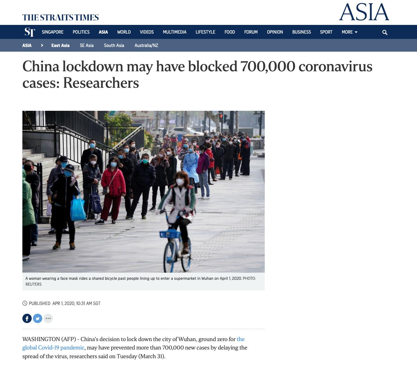 【环球网报道 记者 王博雅琪】据法新社报道,由中国、美国和英国的研究人员3月31日发表在美国权威学术刊物《科学》杂志上的一篇论文称,中国在新冠肺炎疫情暴发初期针对武汉采取的严厉控制措施,为全国其他城市准备并实施各自的限制措施赢得了宝贵的时间,中国政府“封锁”武汉的决定延迟了病毒的传播并可能由此防止了70万例新冠肺炎确诊病例的出现。