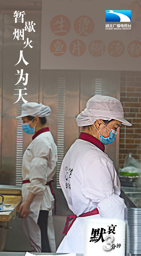 4月4日上午十点,防空警报彻响武汉三镇,汉口吉庆街早餐店忙碌的店员,自觉停下手中的工作,低头默哀,为疫情期间牺牲在抗疫一线的战士和去世的患者表达哀思。