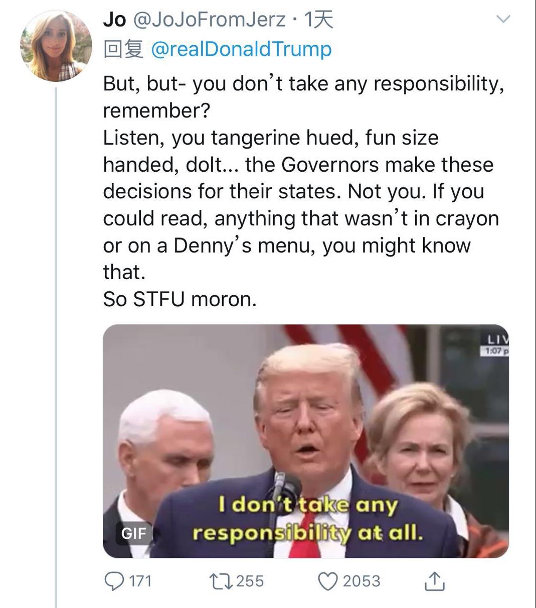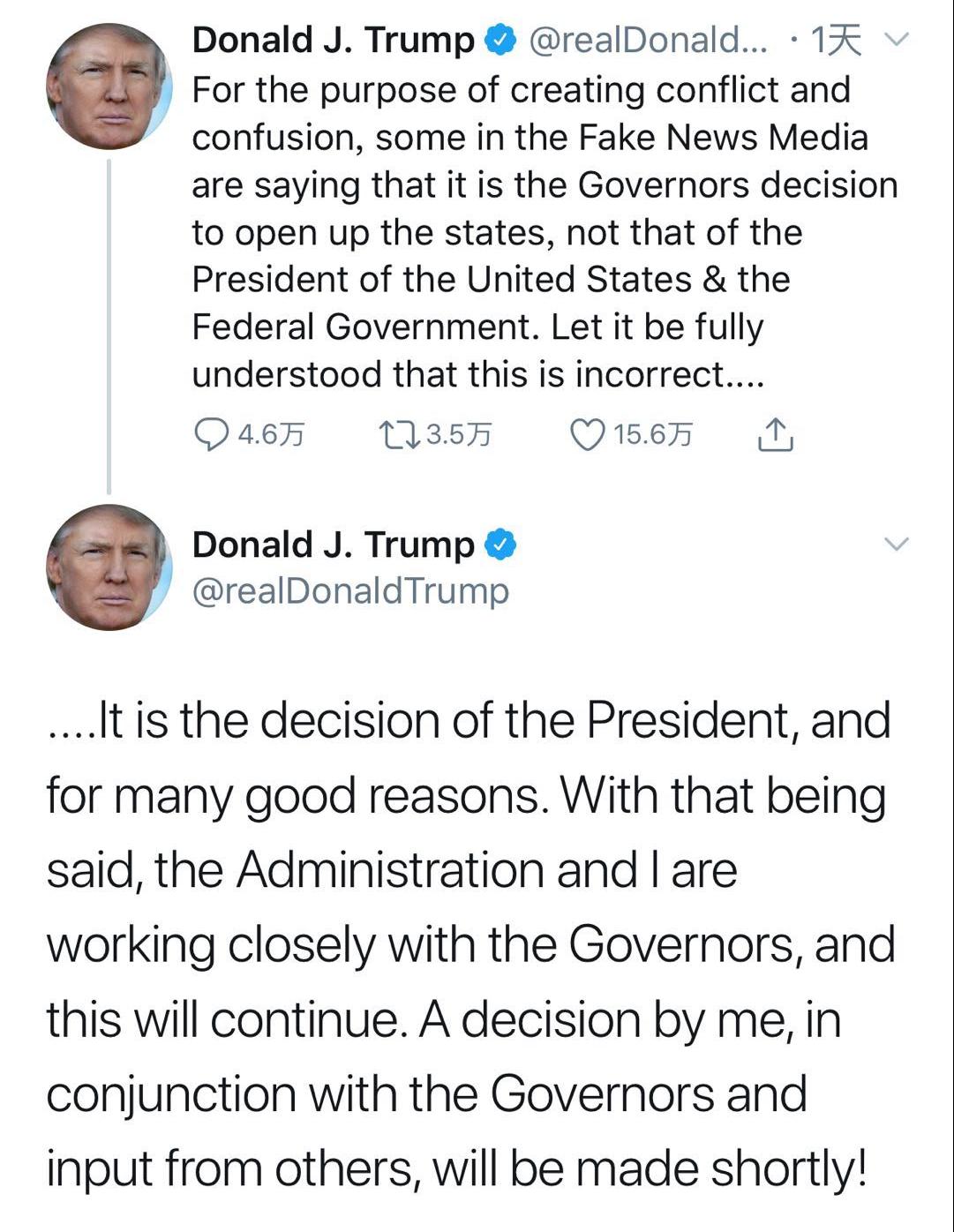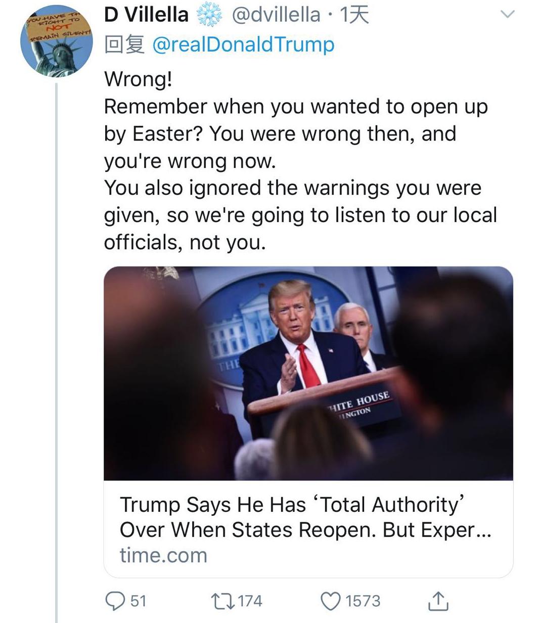 随后特朗普在社交媒体上表示,各州的开放由自己作决定,而不是各州州长,且自己有充足的理由这么做。