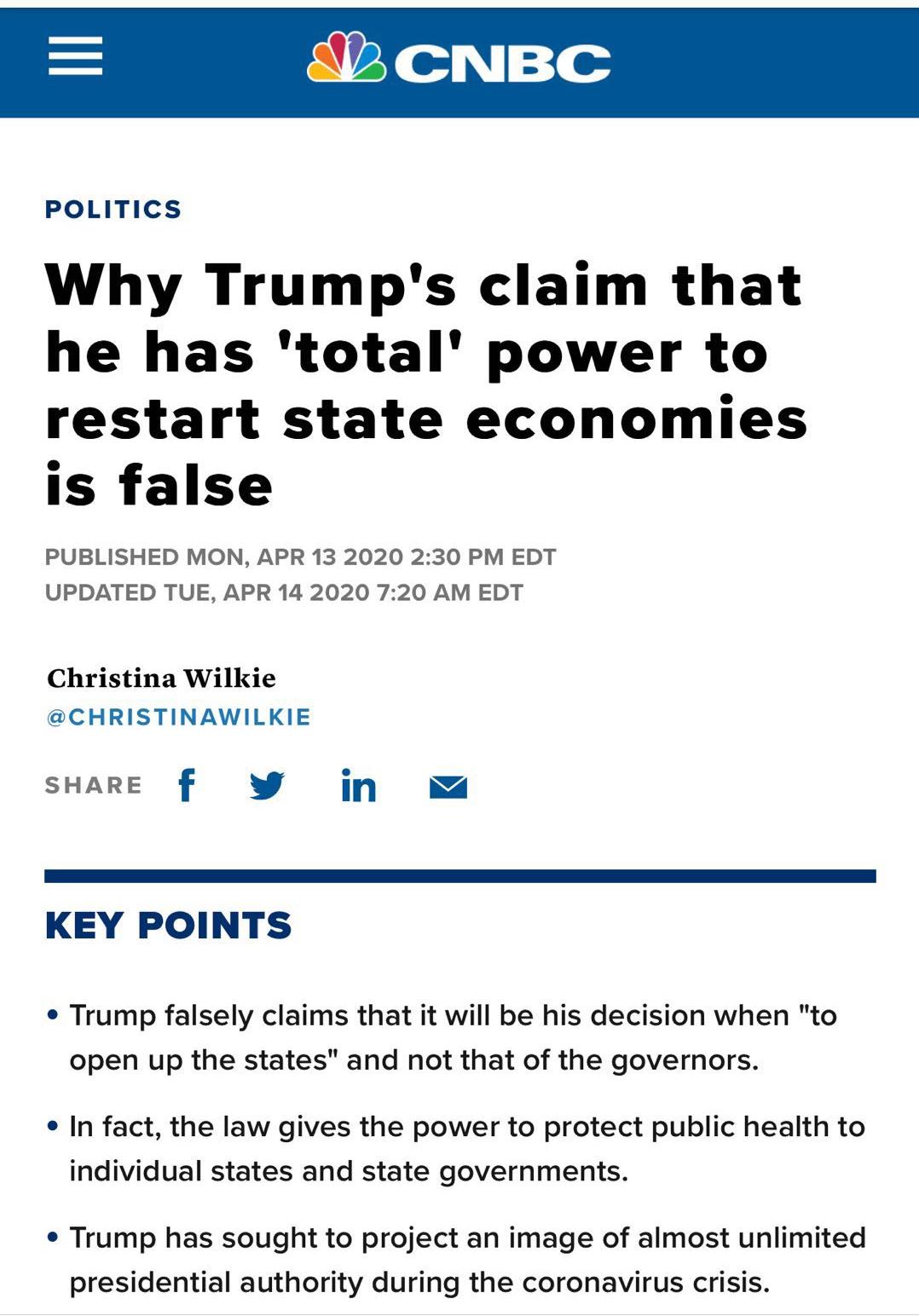 CNBC撰文称,特朗普声称自己拥有“绝对权力”令各州经济重启是虚假的。