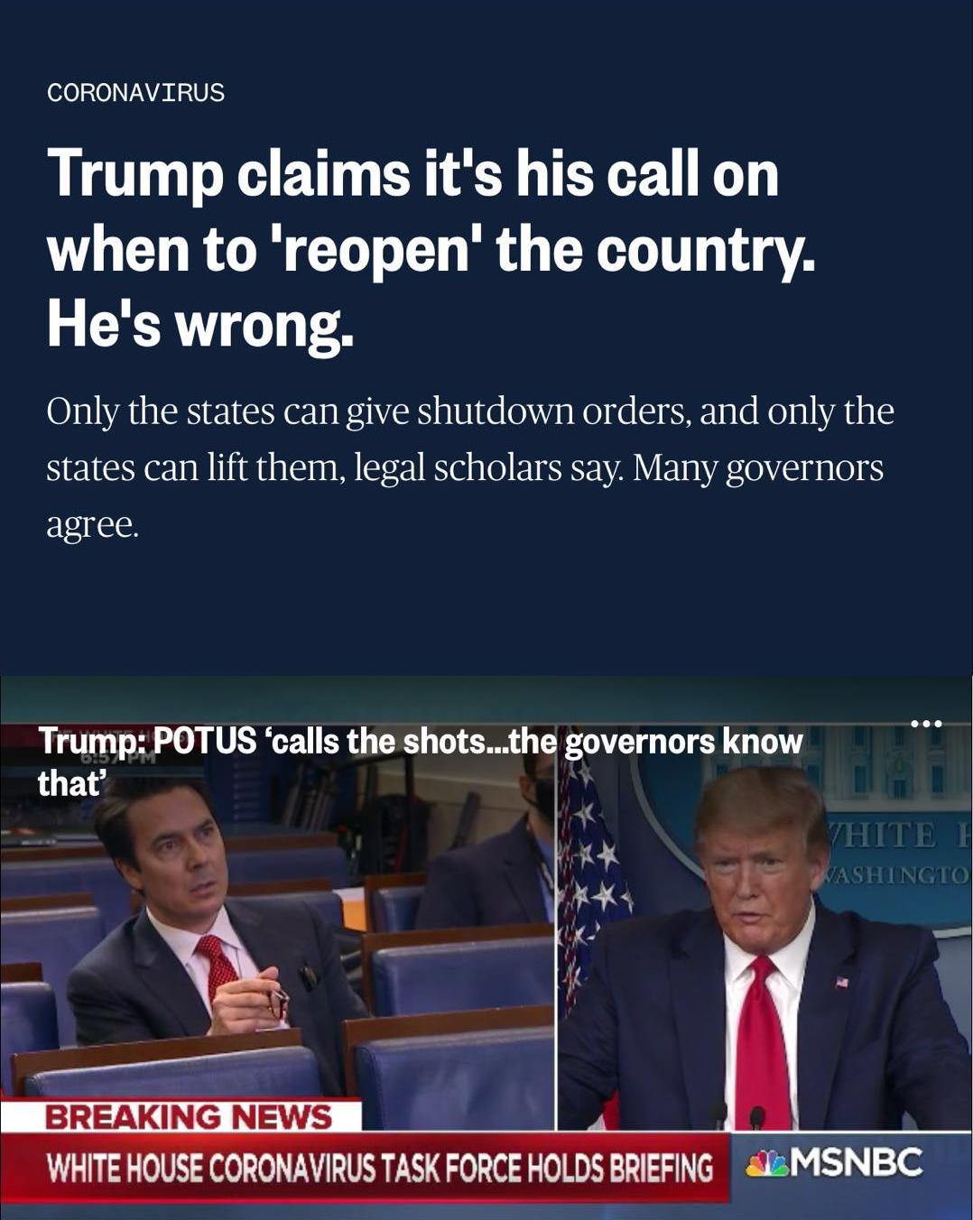 而MSNBC则援引法律学者的观点对特朗普的说法进行驳斥,并批评特朗普不能如何草率地宣布各州重新开放。