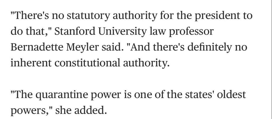 “总统没有被法律赋予这么做的权力。”斯坦福大学的法学教授伯纳黛特梅勒在接受MSNBC采访时如是说。