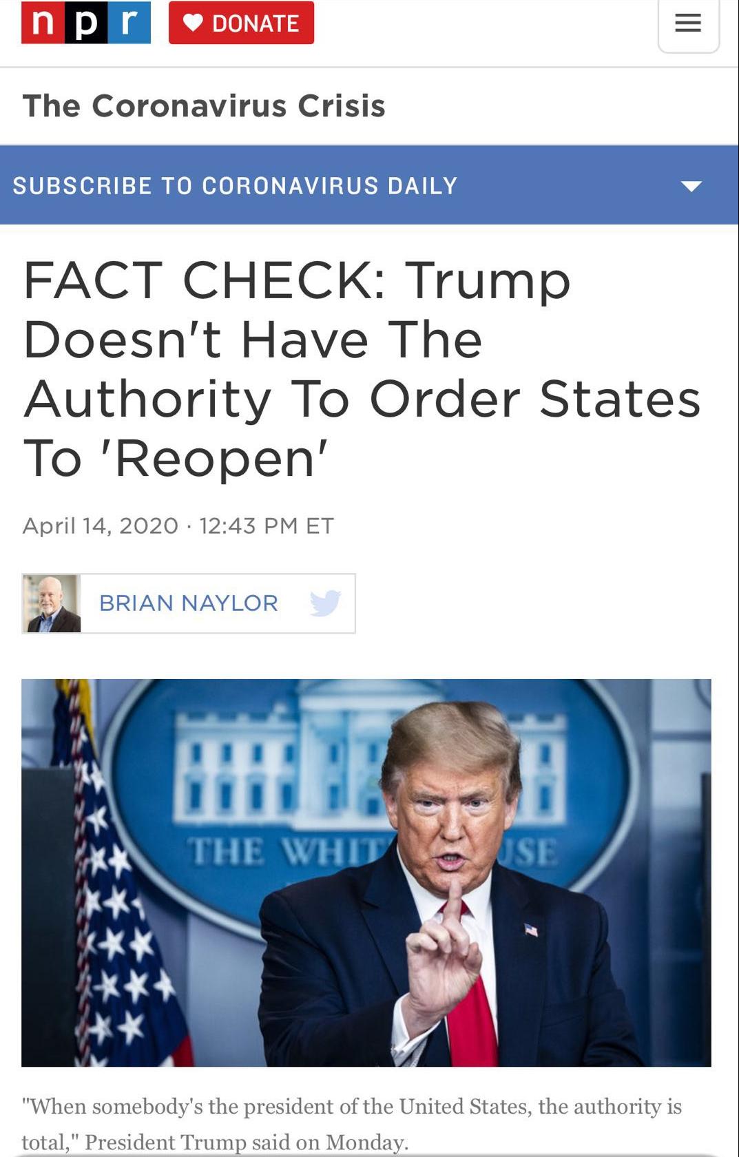 美国公共广播:特朗普没有命令各州“重新开放”的权力。