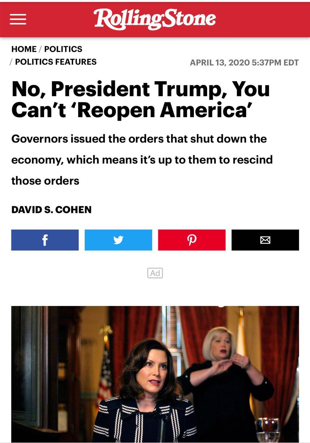 而美国《滚石》杂志则简单直白地将自己的观点写在了他们的标题中:不,特朗普总统,你不能“重新开放”美国。