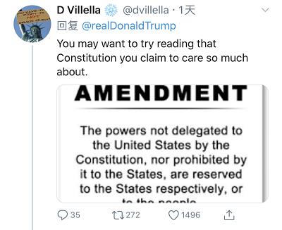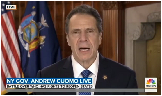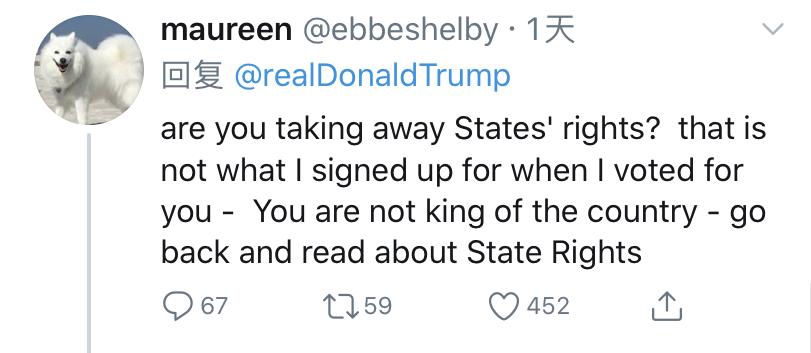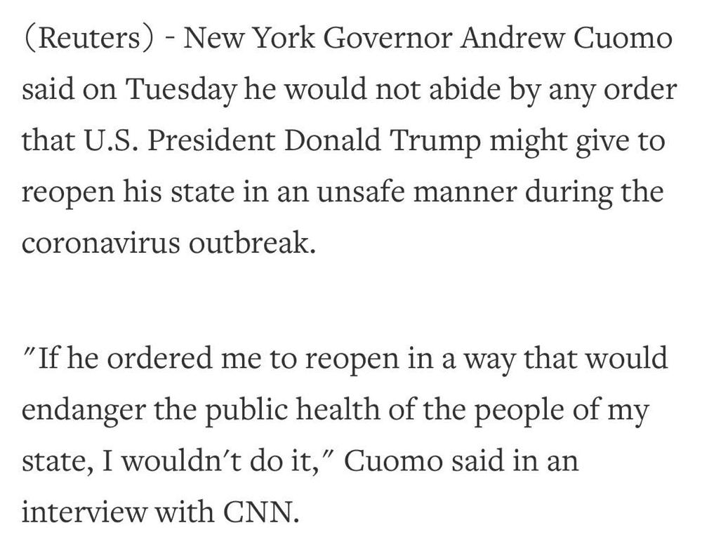 而当特朗普抛出“绝对权力”论,表示自己可以宣布全美各州解除限制状态后,纽约州州长科莫在多个媒体平台上表达了对特朗普的尖锐批评。称特朗普这是“违宪”,是在“自封国王”。