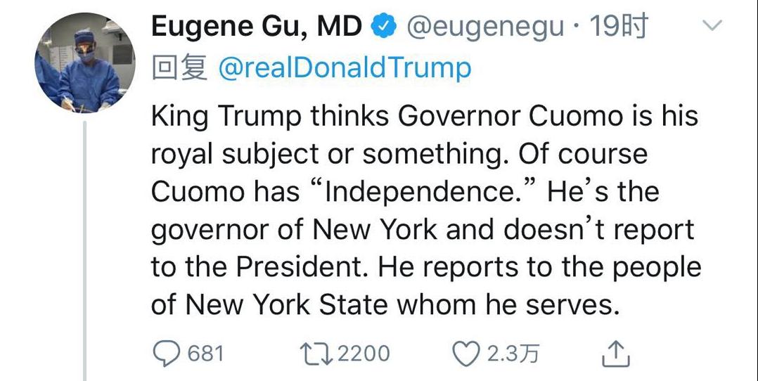 “国王特朗普”认为科莫州长是他的皇室臣民或别的什么。当然,科莫是独立的。他是纽约州的州长且他不向总统汇报。他只向他服务的纽约人民报告。