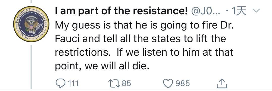 我猜他正在打算开除福奇博士,并解除所有州的限制。如果我们在这件事上听了你的,我们都会死的。