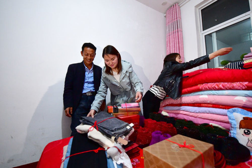 4月15日,在河南省三门峡市卢氏县范里镇滨河小区,新娘沈玉凤(中)和父母一起清点嫁妆。新华社记者 冯大鹏 摄