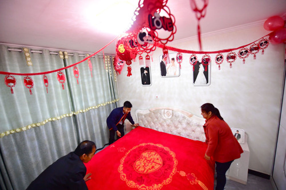 4月15日,在河南省三门峡市卢氏县河洛嘉园小区,新郎王景峰(中)和父母一起布置婚房。新华社记者 冯大鹏 摄