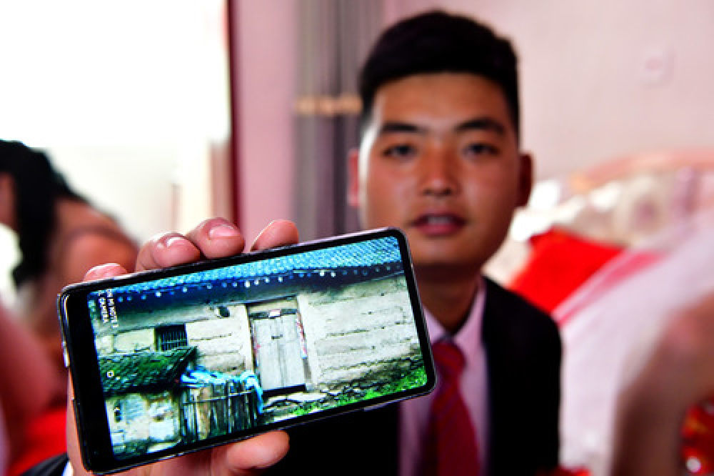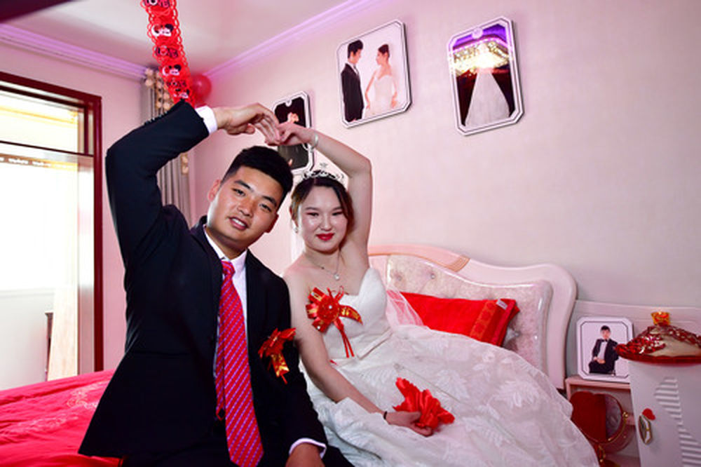 4月16日,在河南省三门峡市卢氏县河洛嘉园小区,新郎王景峰和新娘沈玉凤在婚房中。新华社记者 冯大鹏 摄