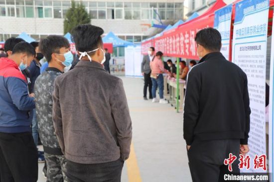 4月中旬,甘肃省临夏回族自治州康乐县迎来扶贫专场招聘会。图为当地民众在招聘会现场咨询。林瑞祥 摄