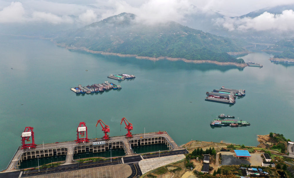 ↑4月18日,船舶行驶在长江三峡五级船闸下游引航道(无人机照片)。