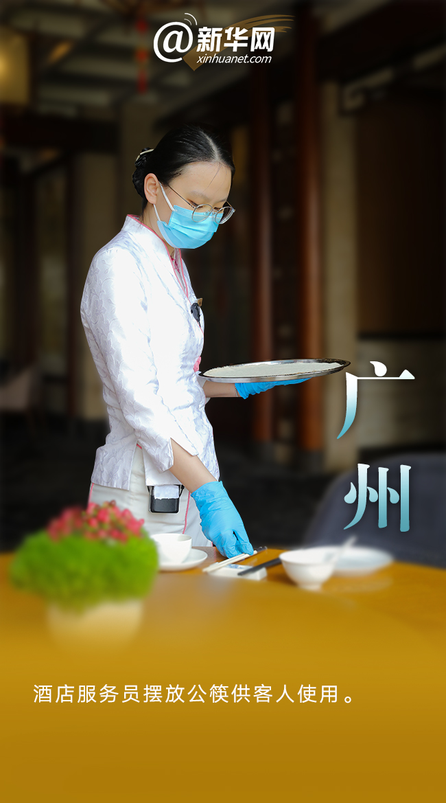 广东素有使用公筷的习惯,餐桌上常有其身影,防疫期间更要落实“公筷原则”。图为广州花园酒店服务员摆放公筷。(新华网 李相博 摄)