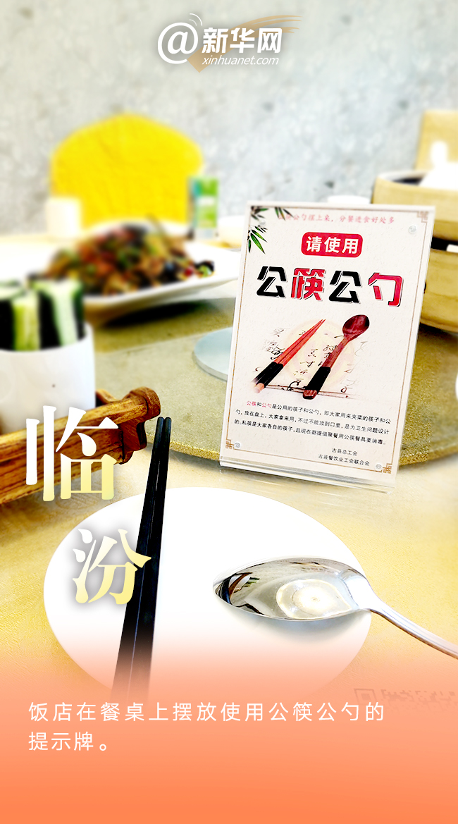 在山西省临汾市古县某饭店内,饭店在餐桌上摆放使用公筷公勺的提示牌。(付宇鹏 摄)