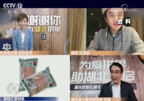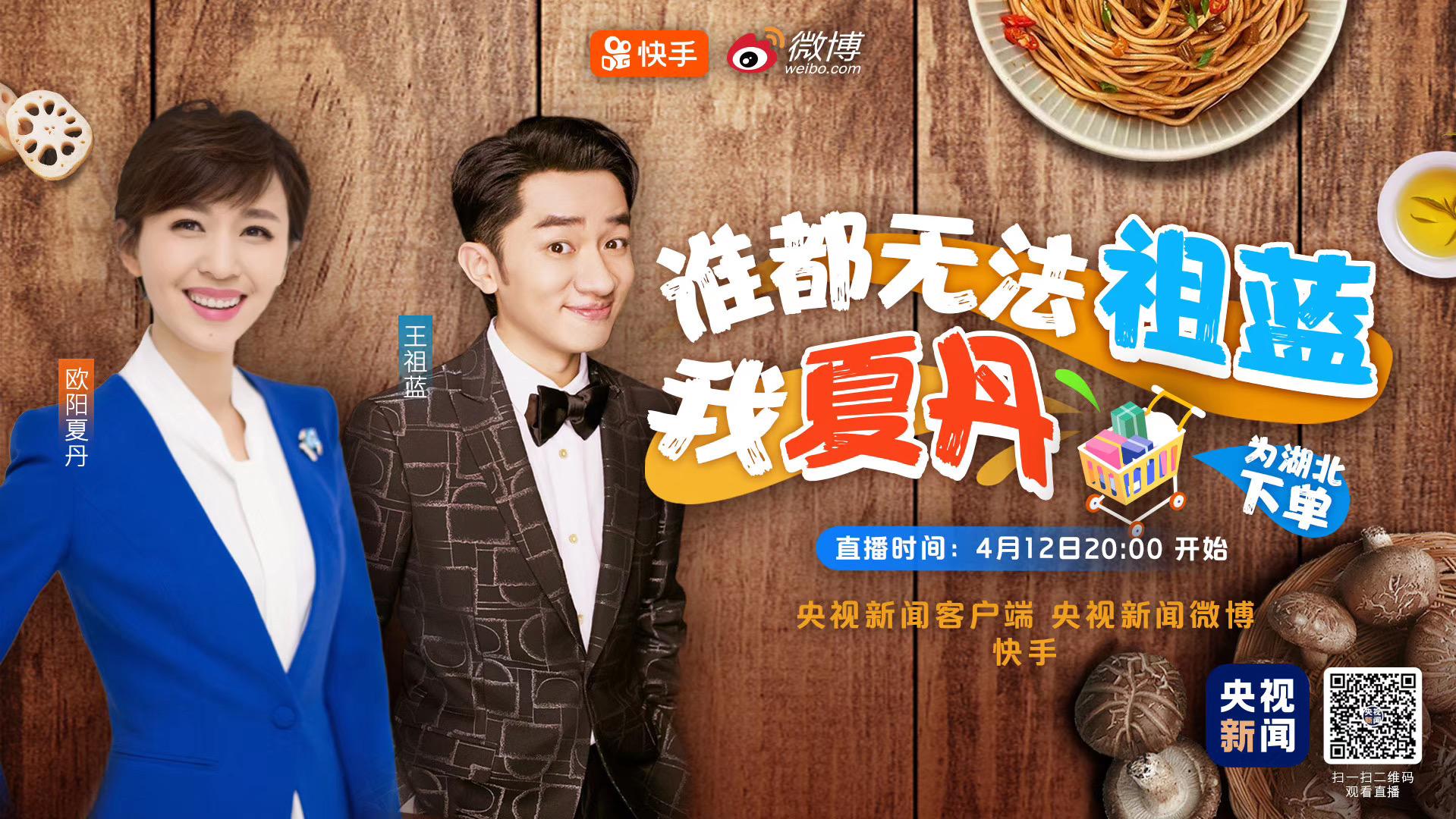 4月12日晚8点,继“小朱配琦”之后,又一场直播再次开启,总台央视主播欧阳夏丹携手演员王祖蓝、郑爽、蔡明、十堰市副市长王晓,以及66位快手达人,在央视新闻客户端、央视新闻快手号、央视新闻微博同步直播,助力湖北农副产品销售和复工复产。整场直播累计观看人次 1.27亿。