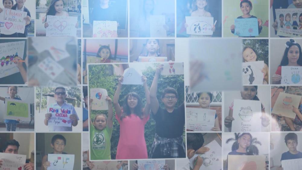 今年2月,10多个拉美国家的孩子们与其画作组成的照片墙。(视频截图)