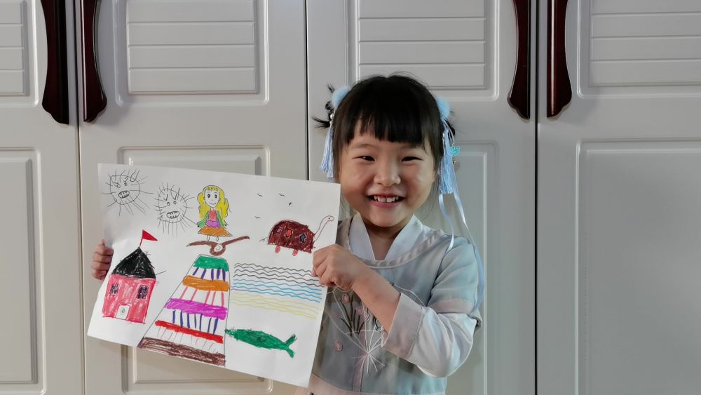 4岁女孩黄奕辰展示自己的画作。(视频截图)