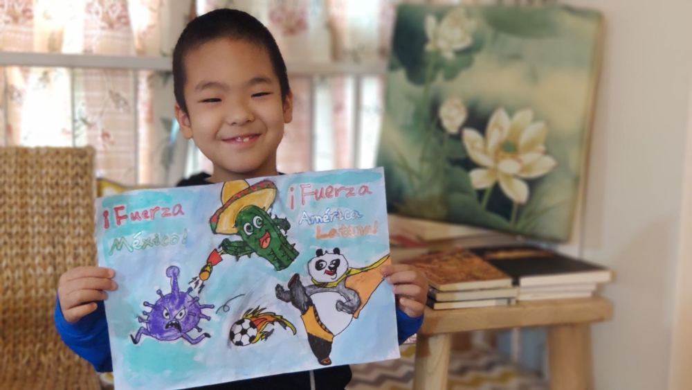 受疫情影响,在厄瓜多尔工作的黄奕辰父亲不得已取消了回国休假计划。黄奕辰则在妈妈的鼓励下,决定画一幅画送给拉美的小朋友,为他们早日打败病毒加油鼓劲。
