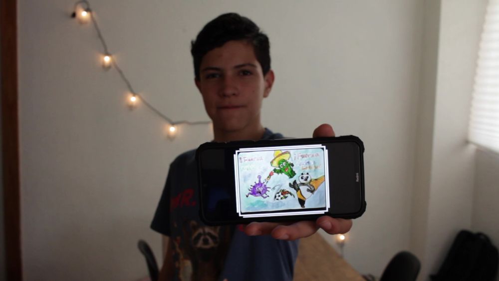 14岁的墨西哥男孩埃米利奥在收到邮件后,将中国小朋友的画存到了自己的手机中。(视频截图)