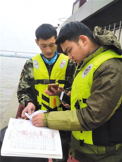 何东顺(右一)和同事在洞庭大桥水域监督船舶污染。