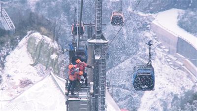 天门山索道共有57个支架。除冰时,检修员要关注每个支架的运行情况,“看一下轮圈有没有打断或磨损,钢丝绳是否跑偏”。一趟除冰作业大概需要一个半小时,每天至少作业四次。张昌衡说:“一切都是为了保证索道正常运营,让游客坐上安全的索道欣赏雪景是很有成就感的事。”