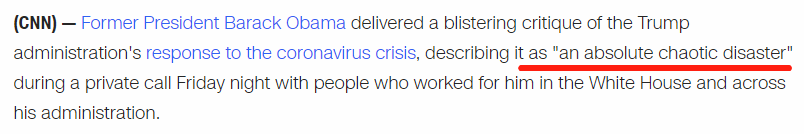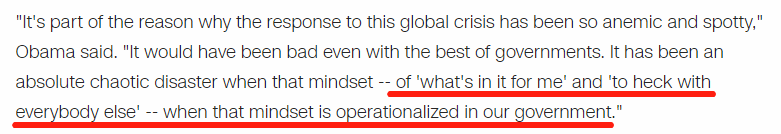 奥巴马表示,特朗普政府如此乏力和不稳定的应对表现归咎于白宫 “对我有什么好处” 的运作观念。此番谴责是奥巴马对特朗普政府迄今为止最尖锐的指责。