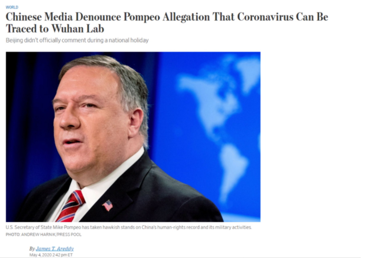 美国《华尔街日报》网站5月4日刊发文章称,美国国务卿蓬佩奥变本加厉地指控新冠病毒疫情可以追溯至中国的实验室,引发中国媒体愤怒回应。