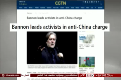 英国广播公司阿语新闻频道(BBC Arabic)5月4日转发《新闻联播》中关于《口出狂言的反华急先锋班农唯恐天下不乱》的口播画面,并引用锐评英文版报道称:“中国中央电视台播发评论指出,美国面临的最大危险不是新冠病毒,而是特朗普政府内部的极右民粹分子;他们的‘甩锅’行为是将美国应对疫情不力的责任转嫁给中国;其所谓的‘追责索赔’毫无依据,目的是逃避自身的责任。”