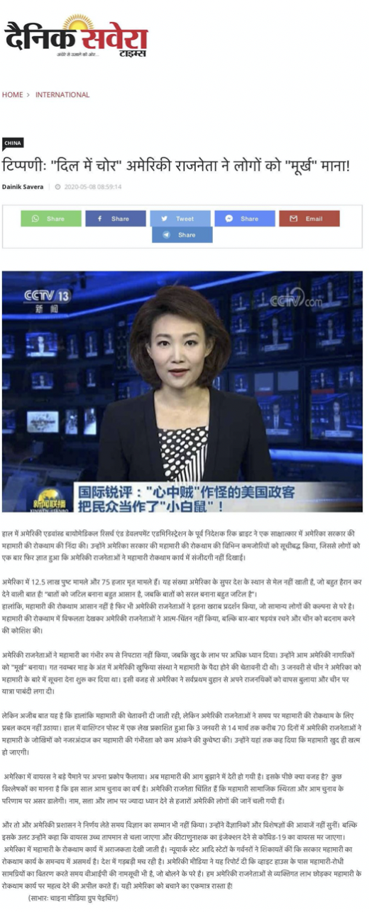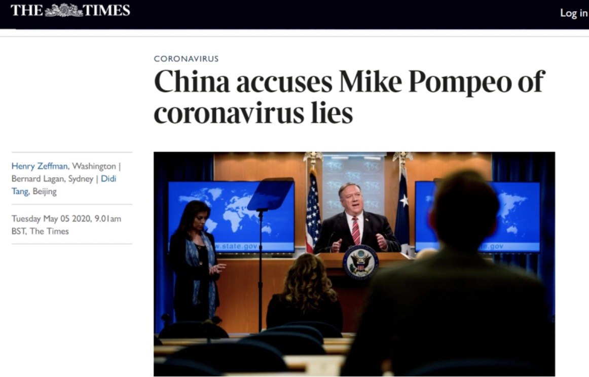 英国《泰晤士报》5月5日发表题为《中国指责蓬佩奥有关新冠病毒的谎言》的报道称:“中国指责蓬佩奥有关新冠病毒的谎言。中央电视台指责蓬佩奥用‘神经错乱的说辞’在‘喷毒造谣’。”