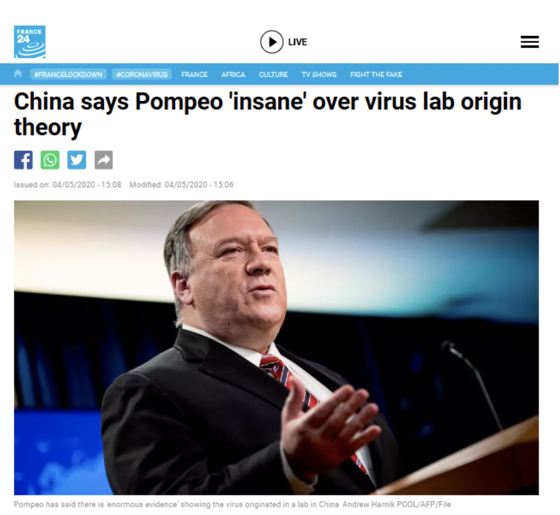 法国24电视台英语新闻频道(France 24 English)和法国24电视台西语新闻频道(France 24 Espanol)5月5日引用《新闻联播》中关于《病急乱投医!邪恶蓬佩奥在科学面前大肆喷毒造谣》的报道。报道称,中国指出,美国部分政客的言论说明其已经“病急乱投医”,急于“甩锅”。
