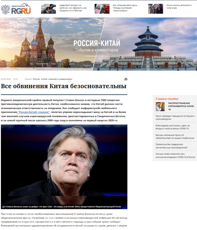 《俄罗斯报》官网5月4日发表题为《所有针对中国的指责都毫无根据》的文章称,美国极右民粹分子史蒂夫·班农在接受媒体采访时诋毁中国抗疫模式,妄称中国要对这场流行病承担经济责任。在美国新冠肺炎确诊病例突破百万、一季度经济创国际金融危机以来最大跌幅背景下,班农将责任归咎中国,毫无道德廉耻。