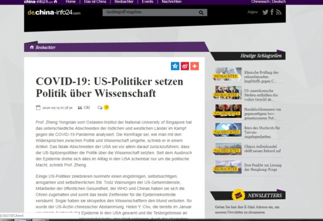 《欧洲时报》德文网5月15日刊发题为《美国政客将政治置于科学之上》的文章指出:“受狭隘的政治私利以及专横傲慢的作风驱动,美国政客屡屡把来自本国情报机构、公共卫生人士、世卫组织和中国等多方的疫情警告当作‘耳旁风’,一而再错失最佳防护窗口期,导致疫情风险在积聚中暴发并最终失控。”