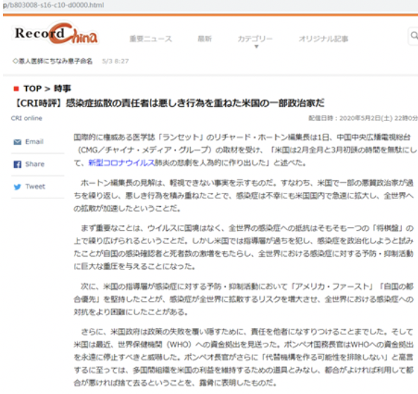 美国有线电视新闻网国内频道(CNN)和美国有线电视新闻网国际新闻频道(CNN International)仅5月1日至3日就连续三天共九次报道称,本周中国中央电视台几乎每天播发评论抨击美国国务卿蓬佩奥对中国的指责,其中有一篇评论指出,“散播‘政治病毒’的蓬佩奥正把自己变成人类公敌。”