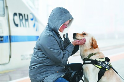在陕西宝鸡南站,训导员带着导盲犬等待乘坐高铁。新华社发