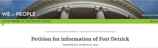3月10日,名为B.Z.的网民在白宫请愿网站发起一条请愿贴,请愿者列出了德特里克堡生物基地与新冠病毒暴发有关的时间线,希望美国政府给出合理解释: